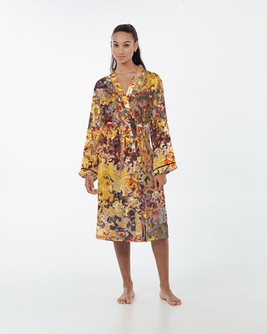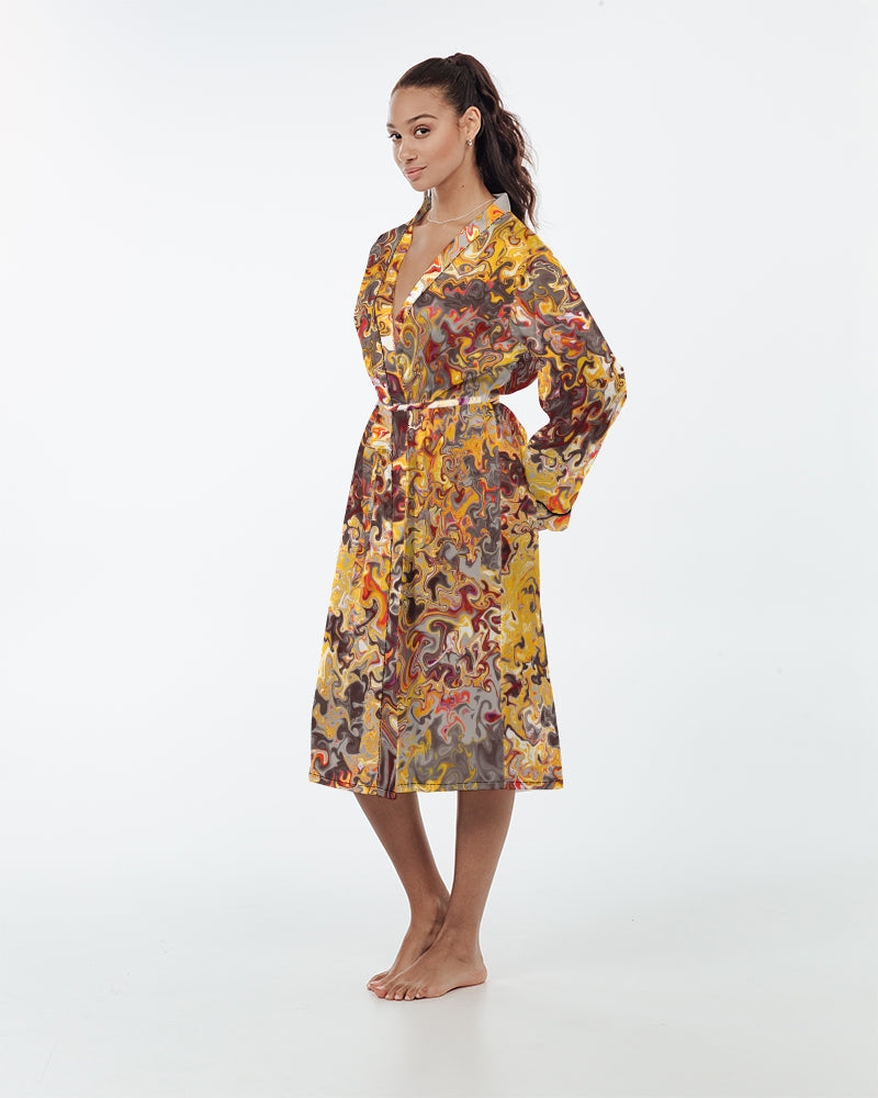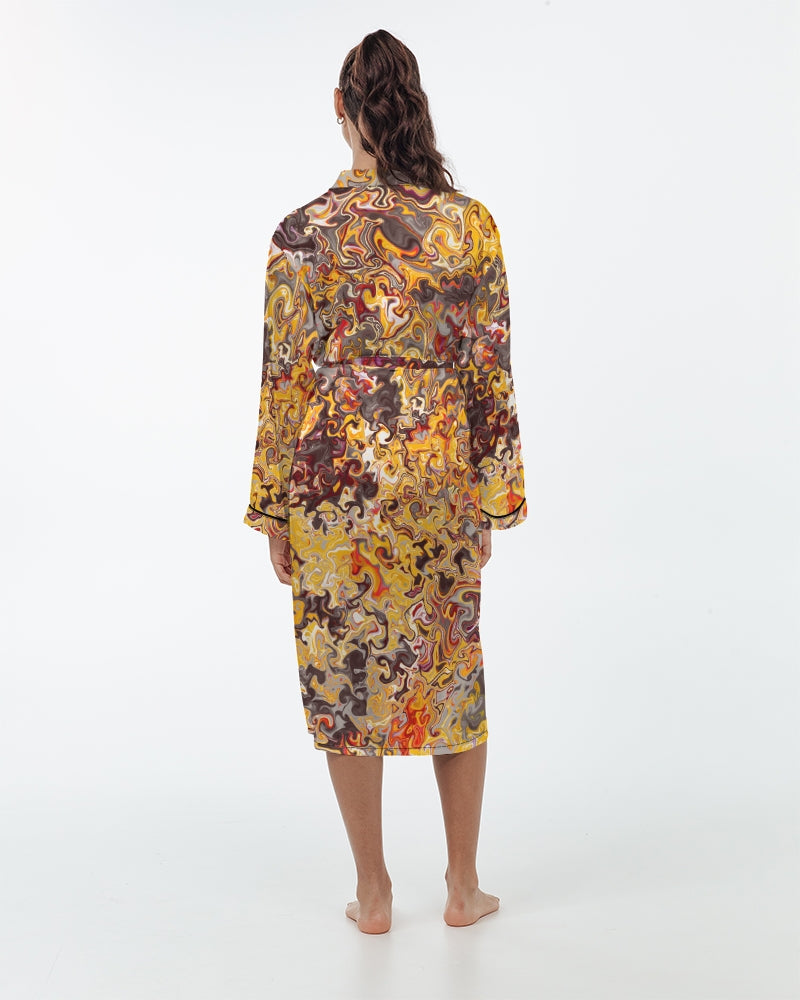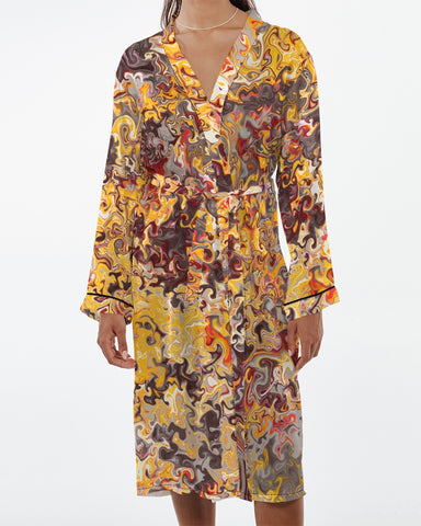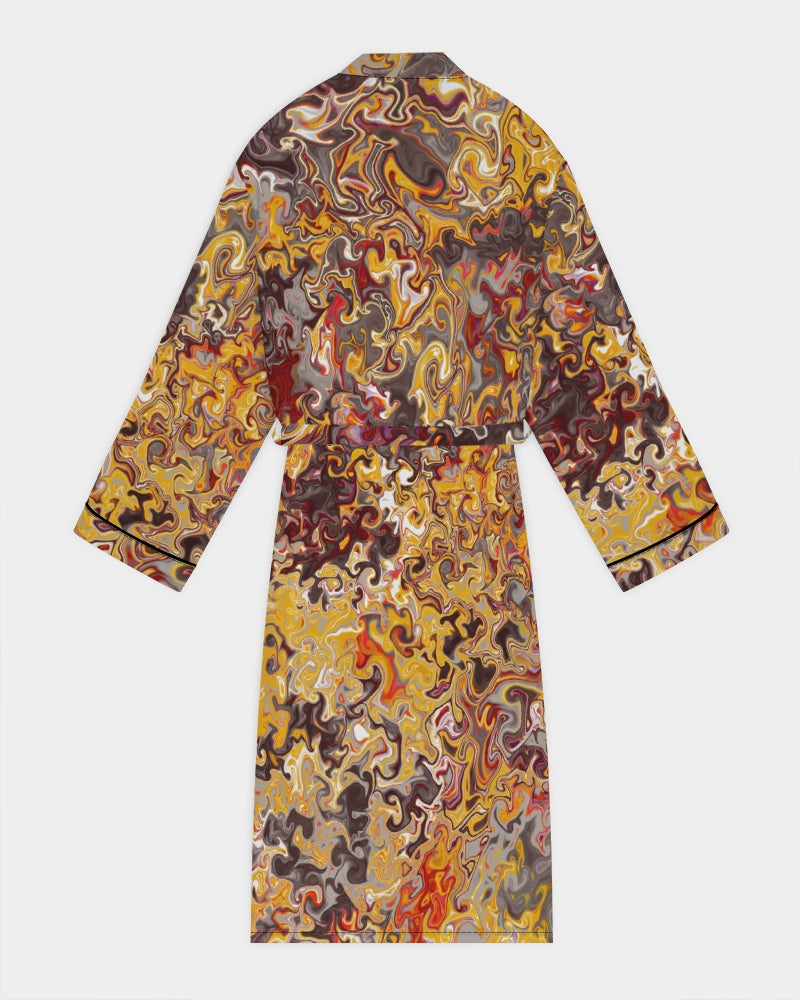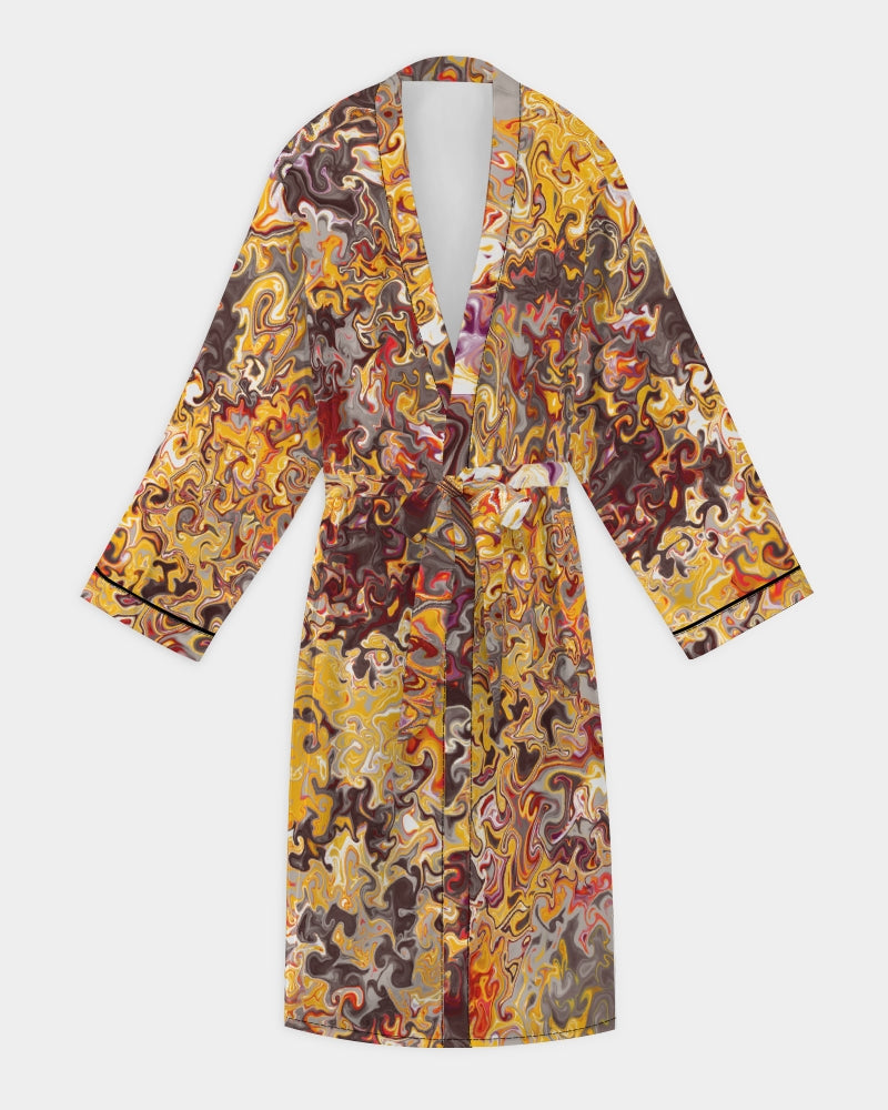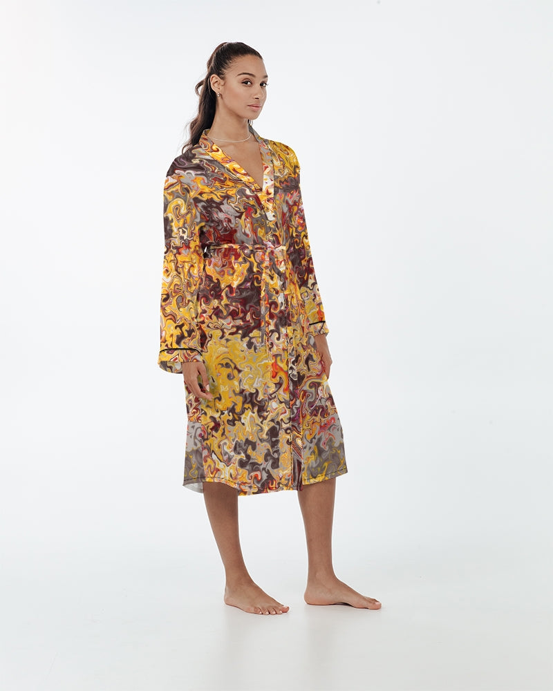 About The ArtThe Inferno PBP Year IV Season V"The Inferno"This collection was born in fire...not destruction, but transformation.Inspired by solar flares, supernovas, and cosmic blazes, The Inferno represents the unpredictable heat of creation. Product DetailsWrap yourself in luxury with our Women’s Satin Robe, designed as the perfect addition to our Women’s Pajama Collection. This silky, elegant robe features delicate piping around the cuffed sleeves and loops to secure the adjustable belt, blending timeless style with ultimate comfort.