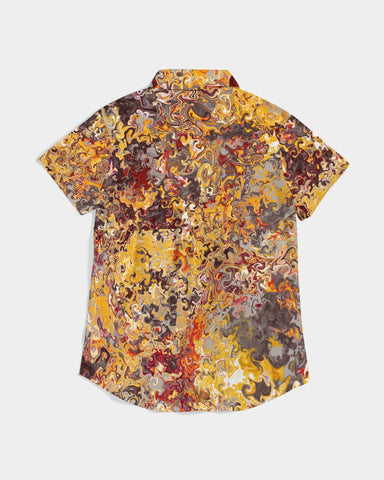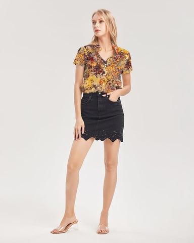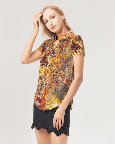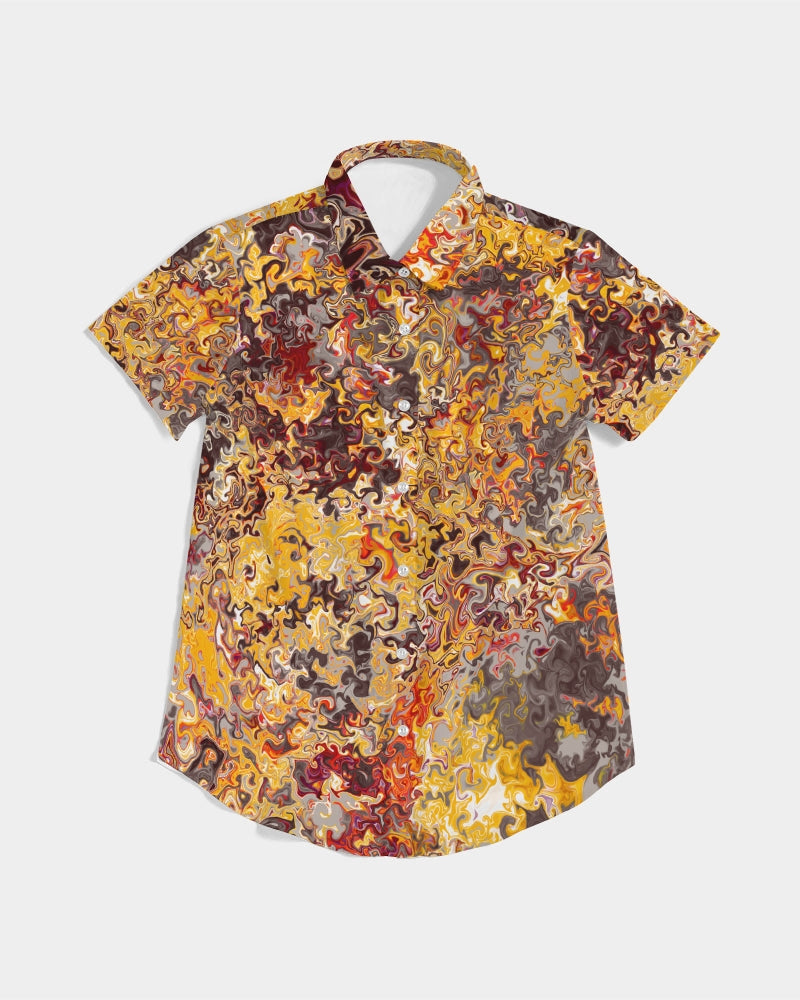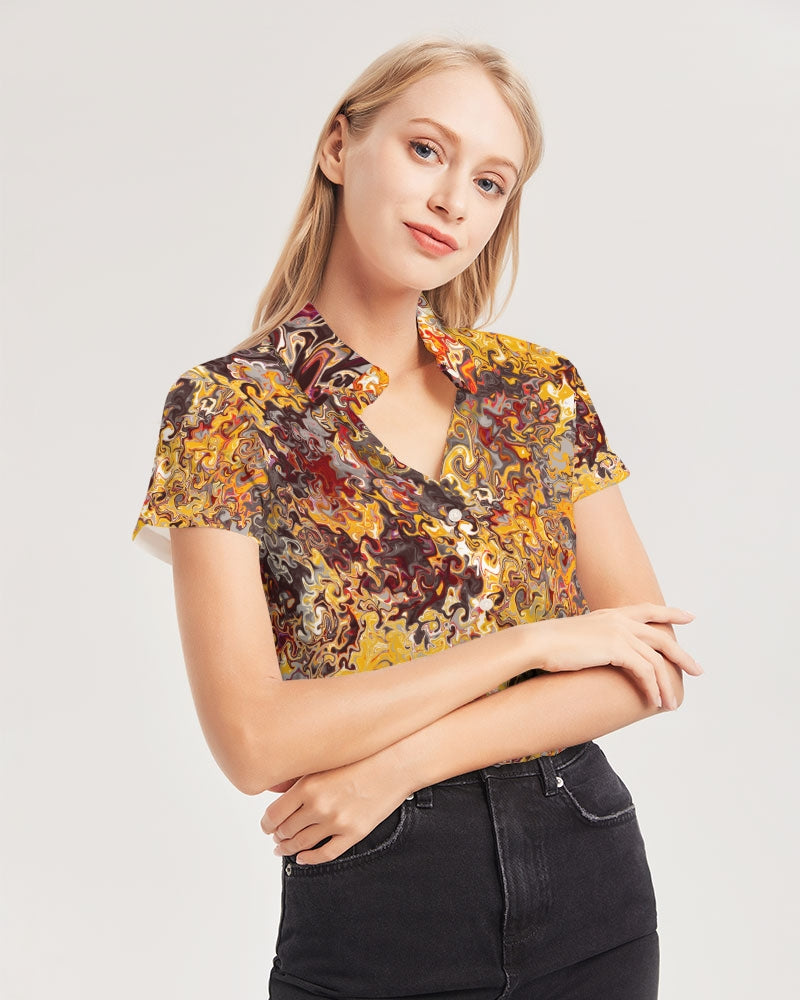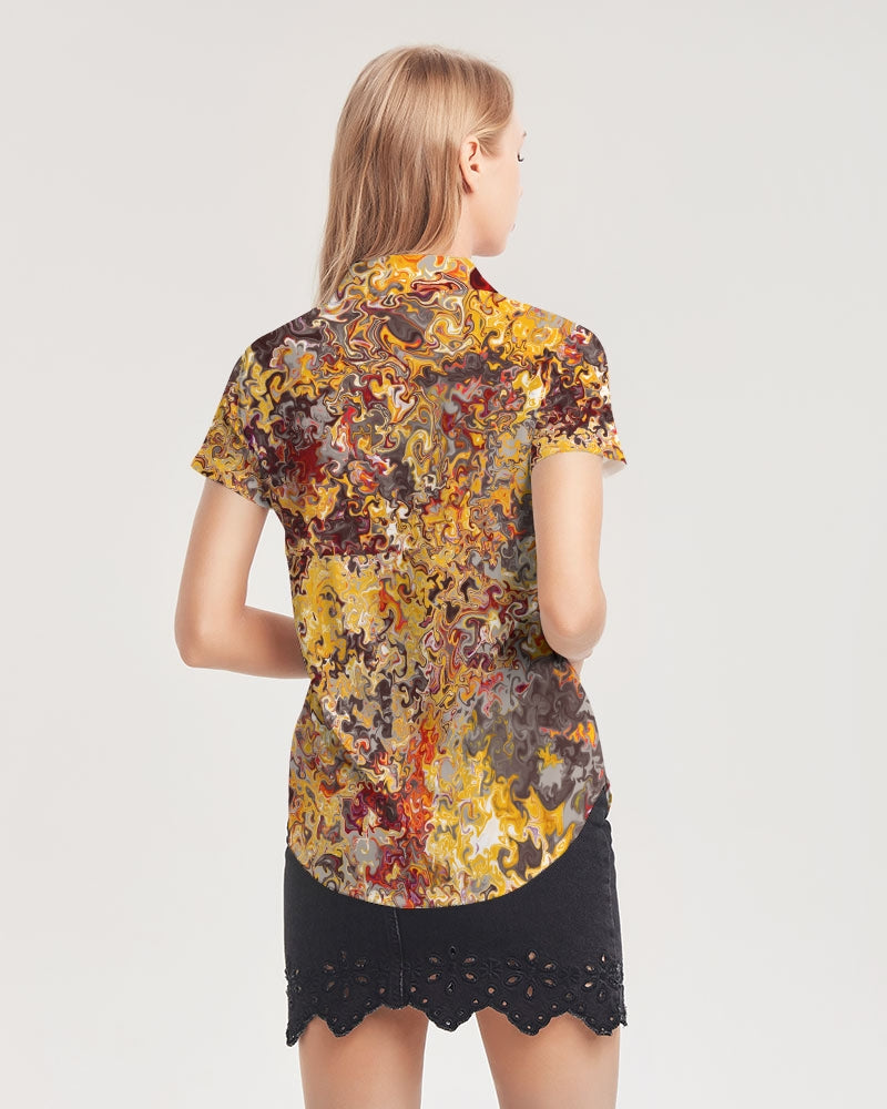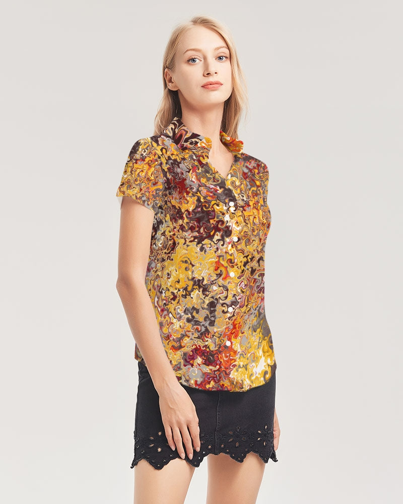 About The ArtThe Inferno PBP Year IV Season V"The Inferno"This collection was born in fire...not destruction, but transformation.Inspired by solar flares, supernovas, and cosmic blazes, The Inferno represents the unpredictable heat of creation. Product DetailsKeep it cute and classic in our Short Sleeve Button-Up Top, featuring lightweight woven fabric, a relaxed bodice, white buttons, and a curved hem. Pair with jeans and a blazer for a casual-chic workday look!