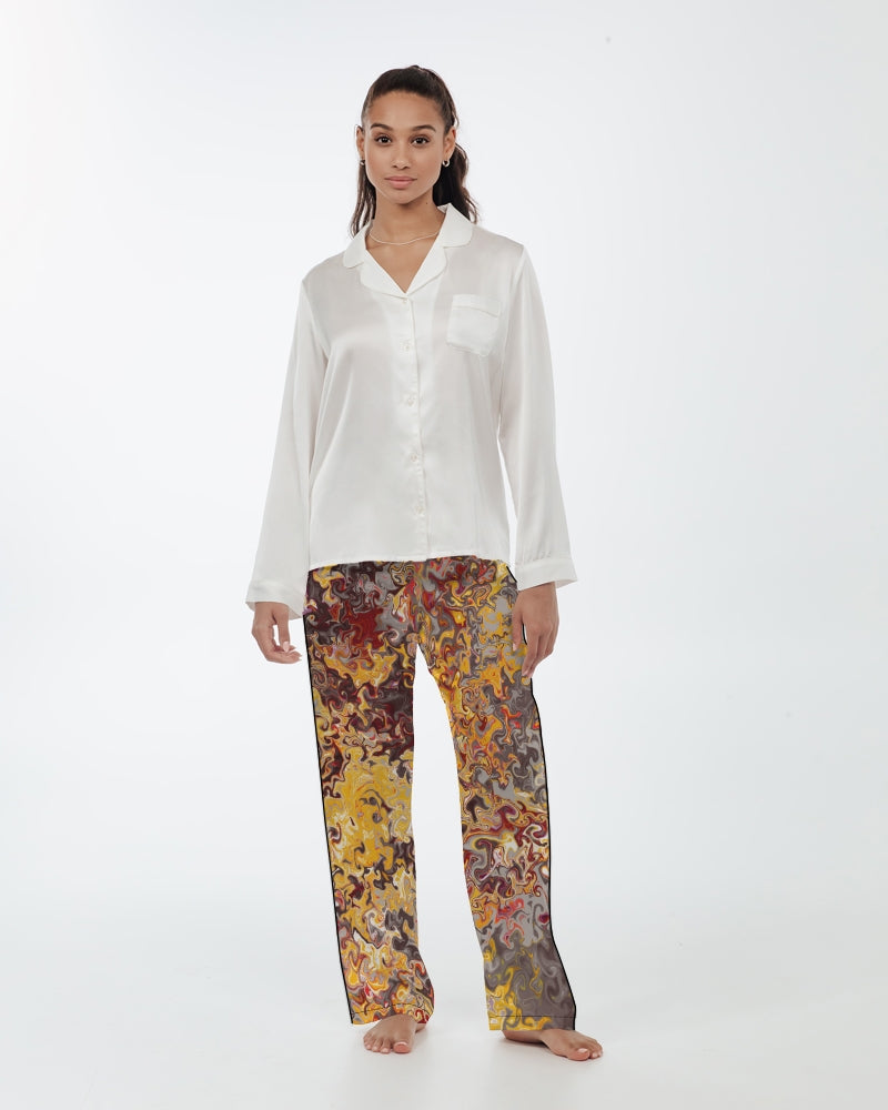 About The ArtThe Inferno PBP Year IV Season V"The Inferno"This collection was born in fire...not destruction, but transformation.Inspired by solar flares, supernovas, and cosmic blazes, The Inferno represents the unpredictable heat of creation. Product DetailsElevate your loungewear with our Women’s Satin Pajama Pants, designed for both comfort and elegance. Perfect for a relaxing night in or a cozy morning, these pants are a must-have addition to your sleepwear collection.