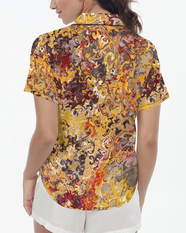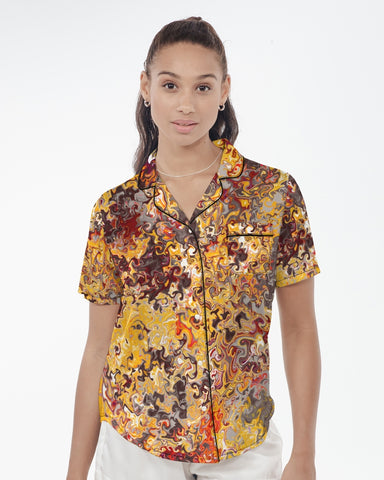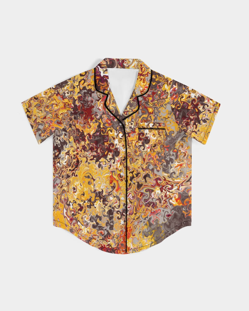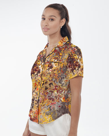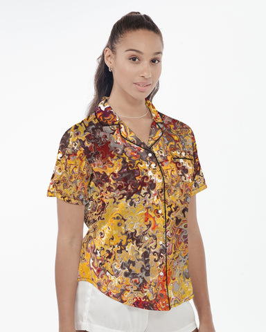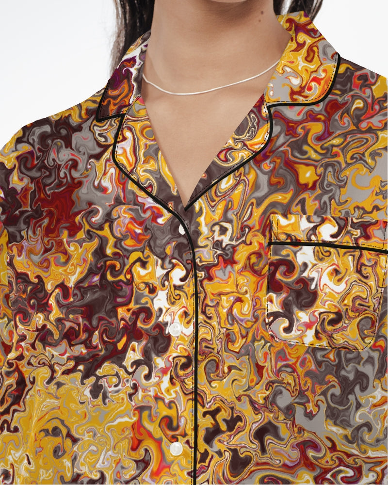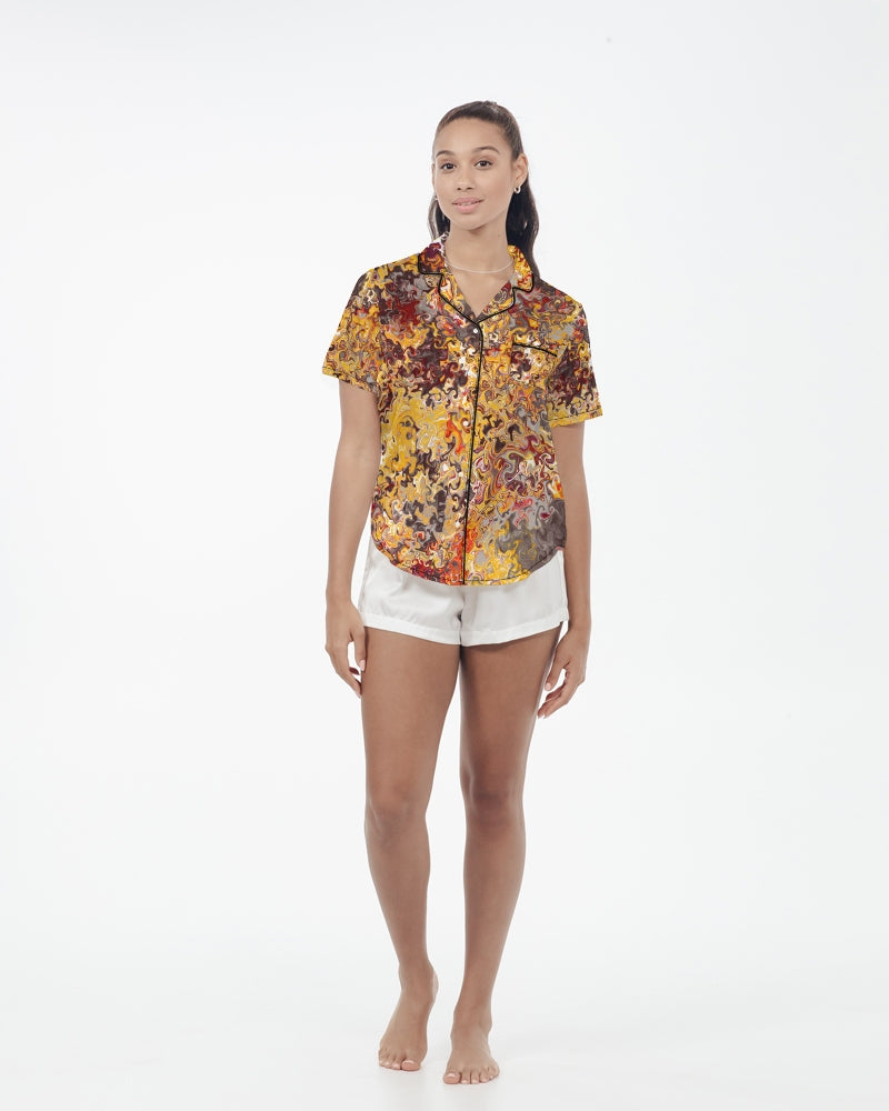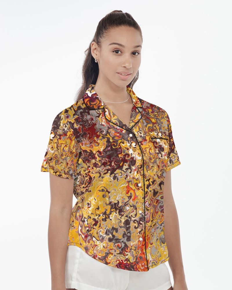 About The ArtThe Inferno PBP Year IV Season V"The Inferno"This collection was born in fire...not destruction, but transformation.Inspired by solar flares, supernovas, and cosmic blazes, The Inferno represents the unpredictable heat of creation. Product DetailsElevate your sleepwear with our Women's Satin Short Sleeve Pajama Top, designed for both comfort and elegance. Made from smooth, luxurious satin, this top features chic piping details around the collar, pocket, and buttons for a timeless look.