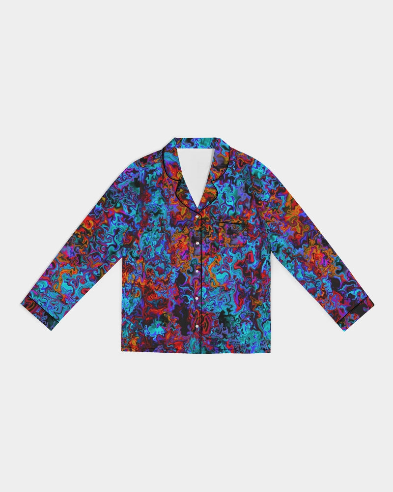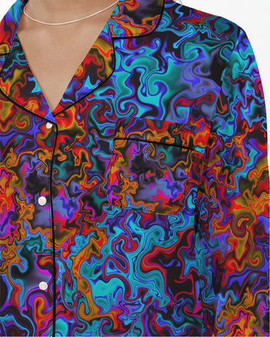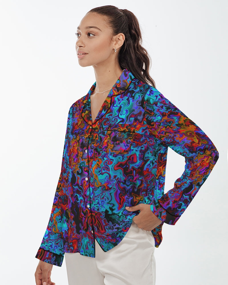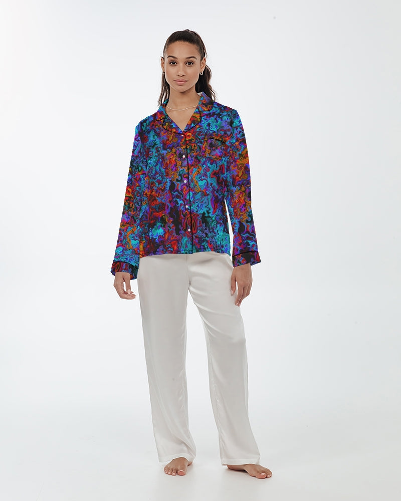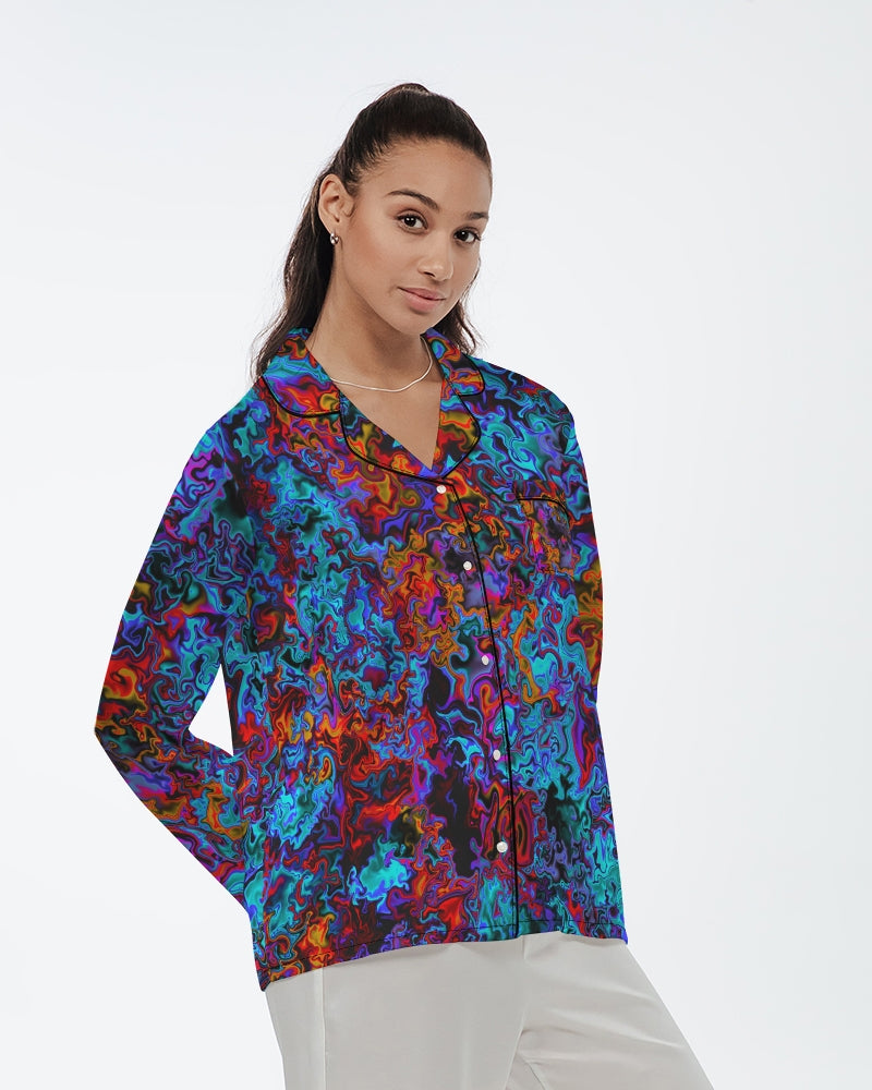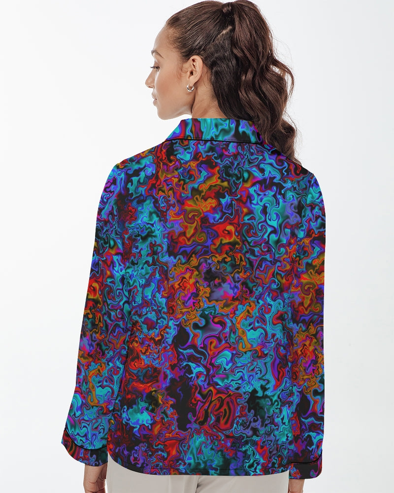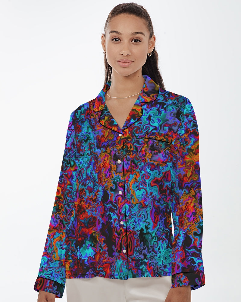 About The ArtThe Veil PBP Year IV Season V"The Veil"Inspired by The Veil Nebula also known as The Cygnus Loop, this collection represents awareness, resilience, clarity, and disillusionment. The Veil Nebula was created by a supernova explosion. The result of a cosmic cataclysm, its existence shows that after even the most world shattering moments, beauty lies beyond the chaos. Product DetailsIndulge in comfort and sophistication with our Women's Satin Long Sleeve Pajama Top, made from soft, 100% polyester satin and accented with classic piping details.